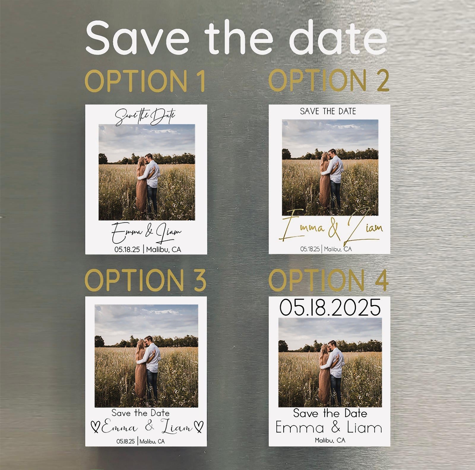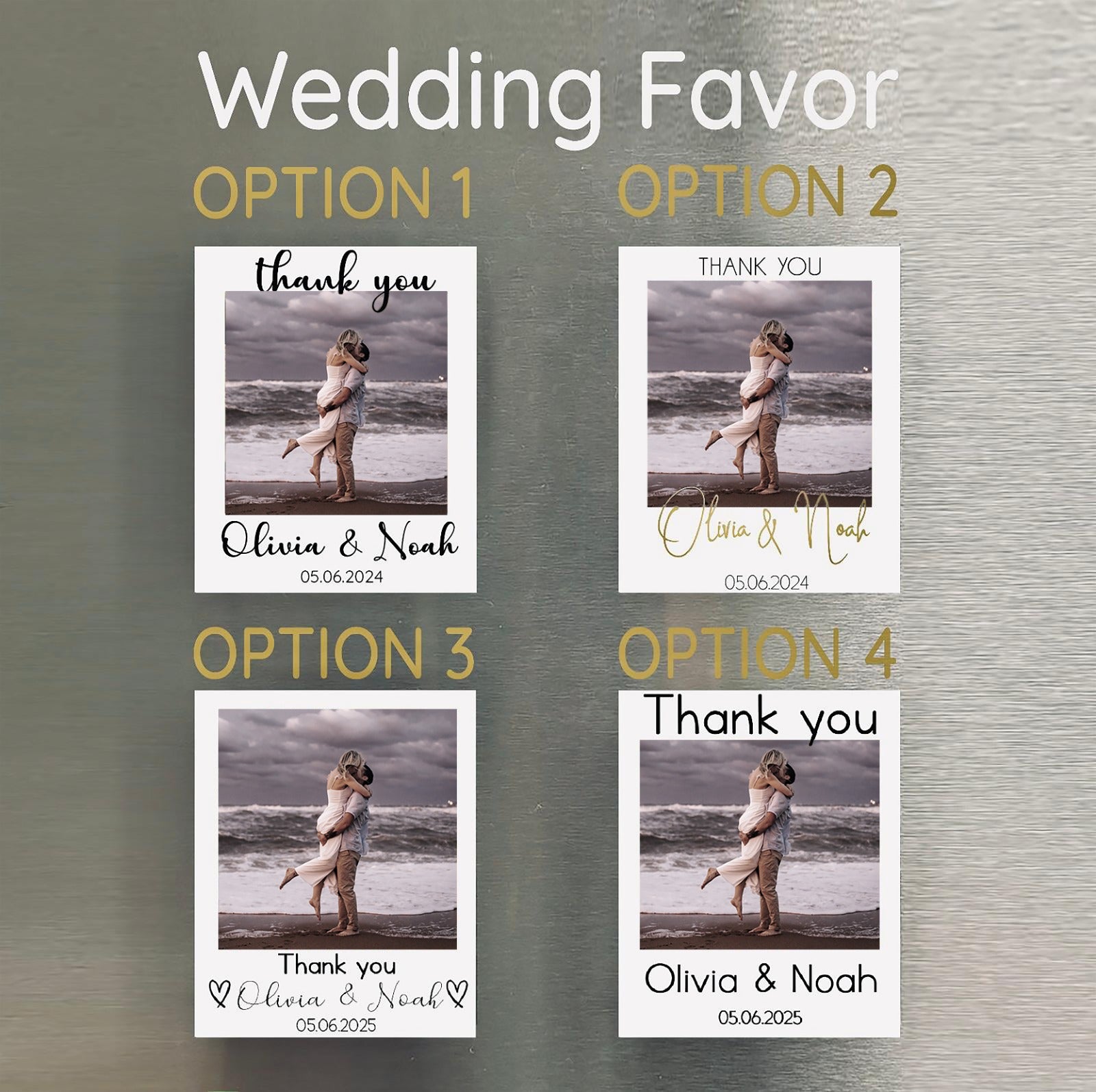 Flat magnets, with a magnetic sheet on the back and the best quality photo paper. Choose between our designs for Save the Date Magnets and Wedding Favor Magnets.